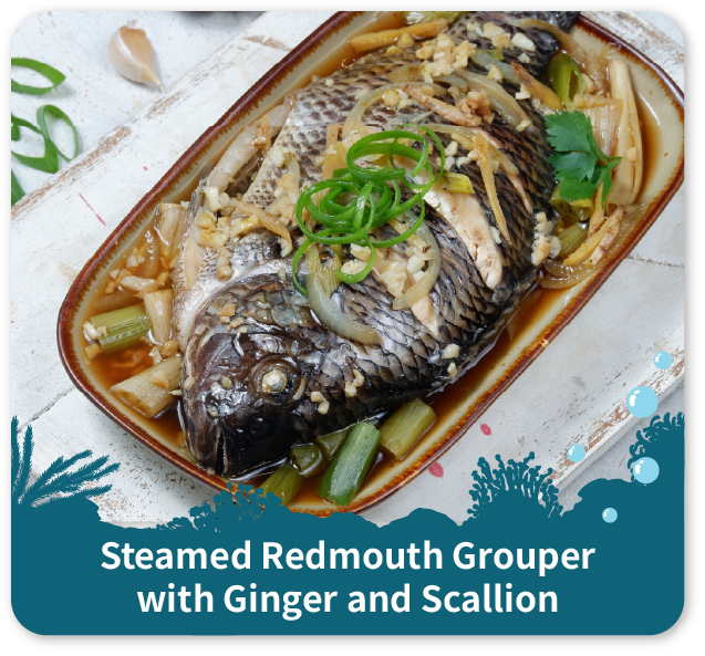 Redmouth grouper 500g, 1 teaspoon sesame oil, 1 tablespoon soy sauce, 2 tablespoons vegetable oil, A pinch of scallions (chopped), a pinch of shredded red bell pepper (for garnish).